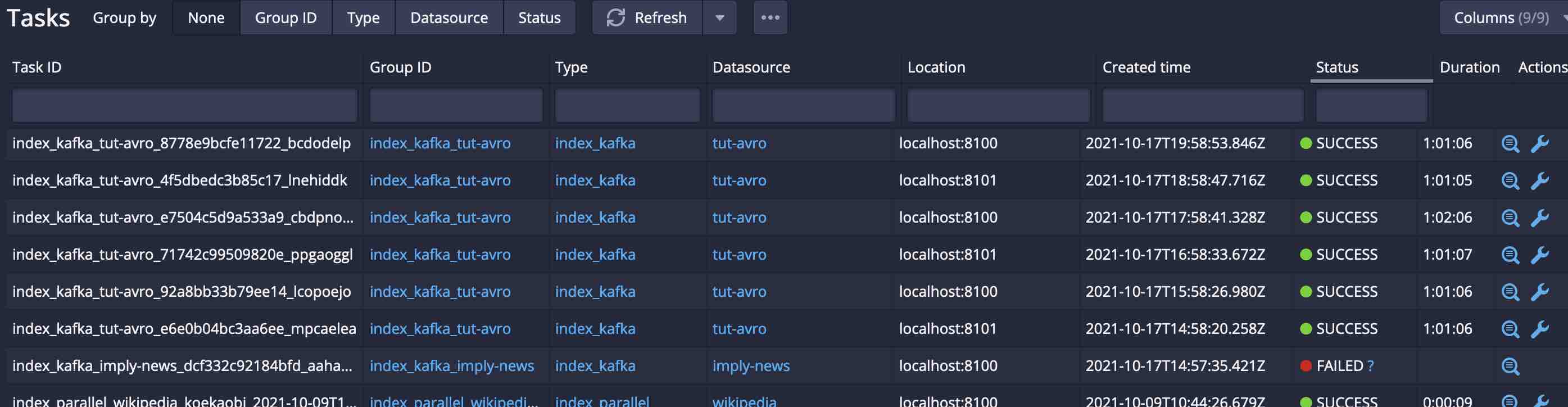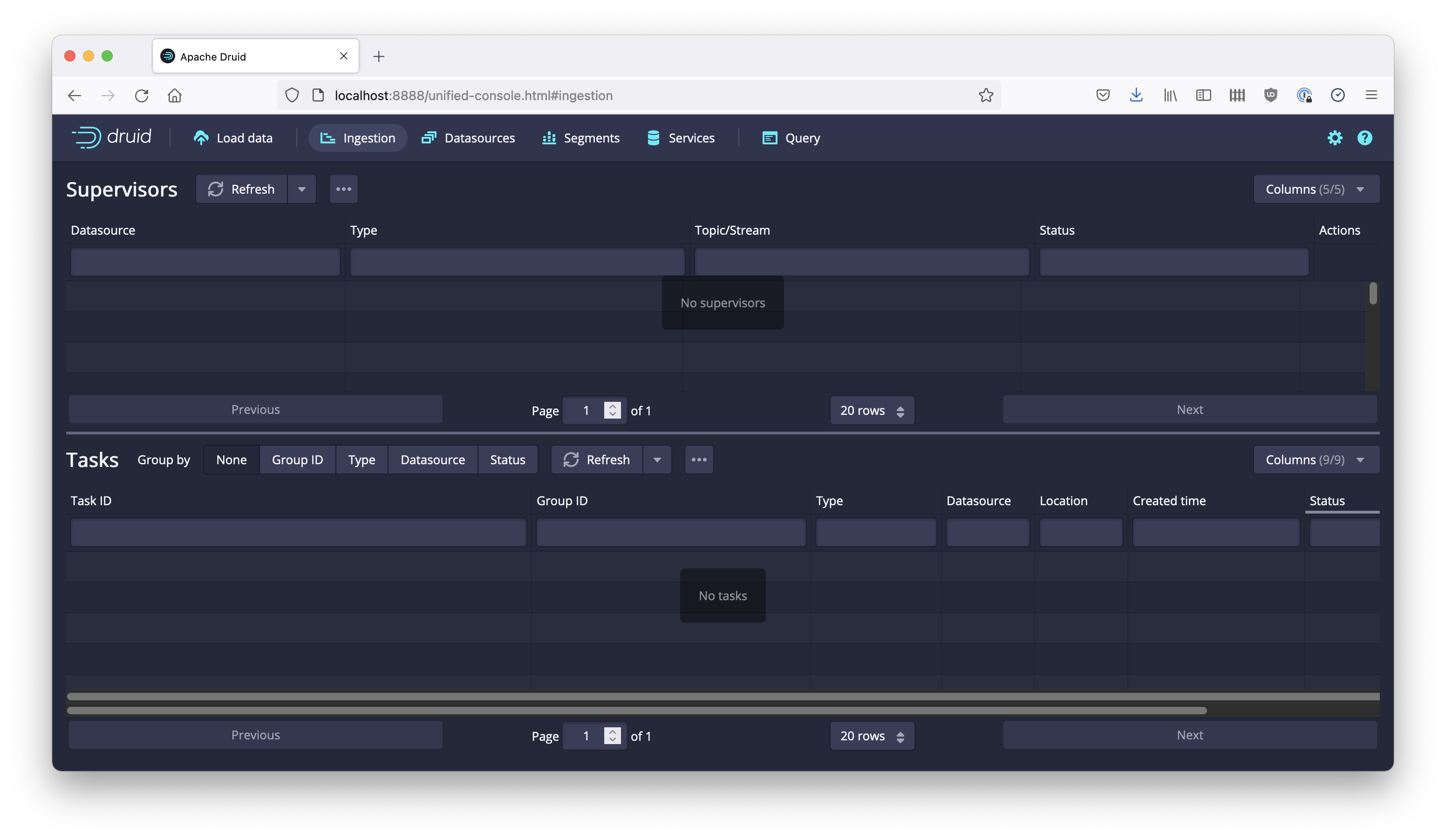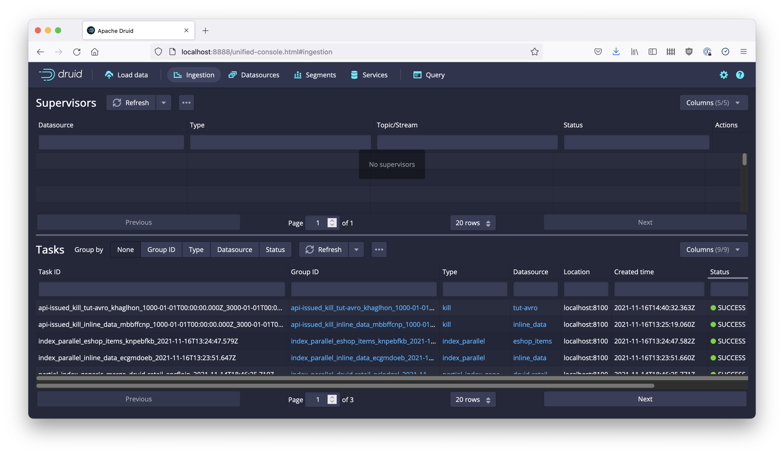 The Druid Console gives users easy access to many functions of Druid. For data ingestion, the task view is interesting. It shows a list of running supervisors in the upper half of the window, and individual ingestion tasks and subtasks in the lower half.