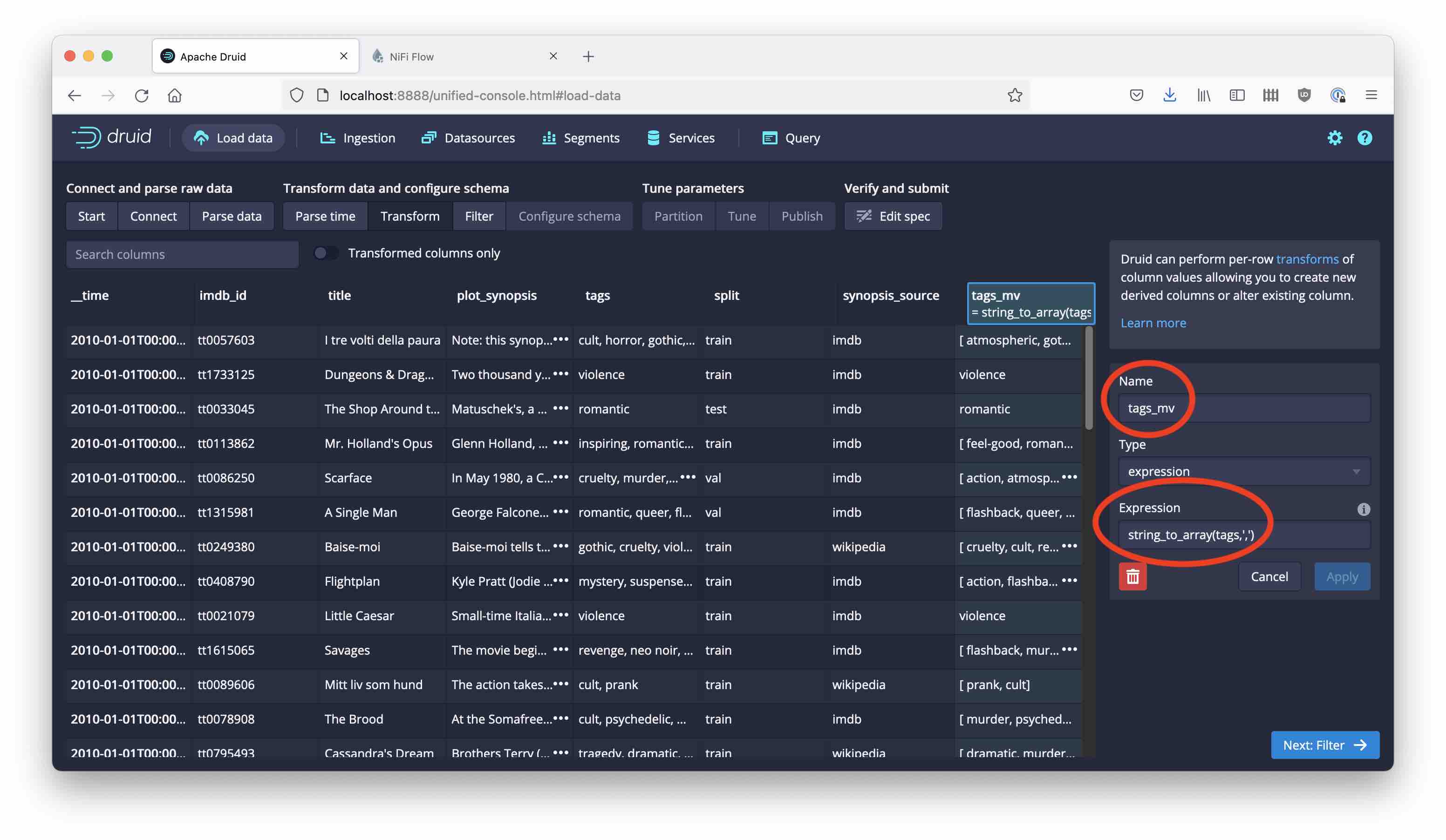 Apparently, the plot_synopsis field of our data file contains multi-line strings. Druid’s parser cannot handle linefeeds inside CSV fields, so we need to resort to some preprocessing. If we can somehow parse the CSV, replace all the linefeeds inside the data field with spaces, and write the result back, we should be fine.
